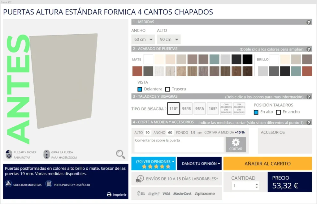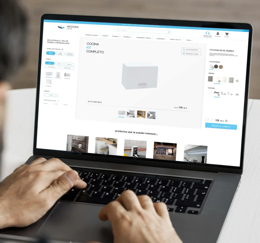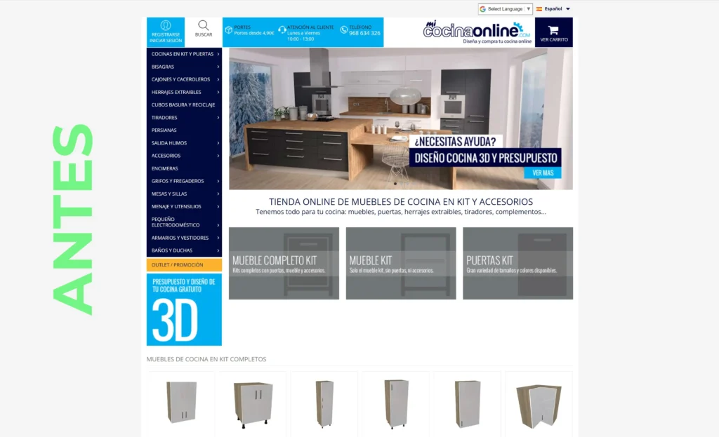 Rebranding y diseño de web. Esta tienda Online fue sufriendo mejoras en cuanto a su interfaz e imagen. Primero se empezó por mejorar el logo, escoger una tipografía más versátil y moderna que ayudara a la legibilidad y los colores se mantuvieron. Luego pasamos a hacer propuestas de prototipos de interfaz y para ello se hizo un estudio previo del usuario: como se movía por la web, qué productos se vendían más, qué preguntas hacían, etc. Sabíamos que comprar una cocina no era algo sencillo, y más de asimilarlo una persona sola con el gasto que conlleva, requiere en la mayoría de veces de asesoramiento. Por ello quisimos proponer mejorar la ficha de producto, crear más espacios entre cada bloque para no agobiar visualmente, intentar aclarar varios puntos y colocarlos de manera lógica. Una de las grandes ideas que no se llevó a cabo por falta de medios económicos, fue un modulador 3D con columnas de compras funcionales y visuales en el propio mueble, esto se muestra en el video que os dejo a continuación. Aunque la página no llegó a ser 100% lo planteado, sí que obtuvo muchas mejoras. Podrás ver el ejemplo del antes y después en las capturas.