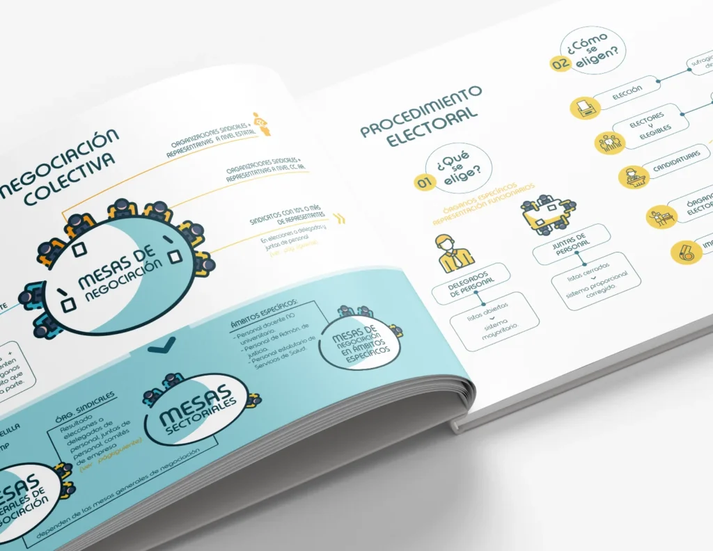 Diseño de libros, portadas, maquetación e ilustración infográfica. Trabajé durante año y medio en Opoesquemas creándola desde cero, con el branding de la marca al completo. Creación y diseño editorial desde los esquemas con un estilo propio, colores e iconos personalizados, hasta infografías muy divertidas para facilitar a el estudio en libros y poster.